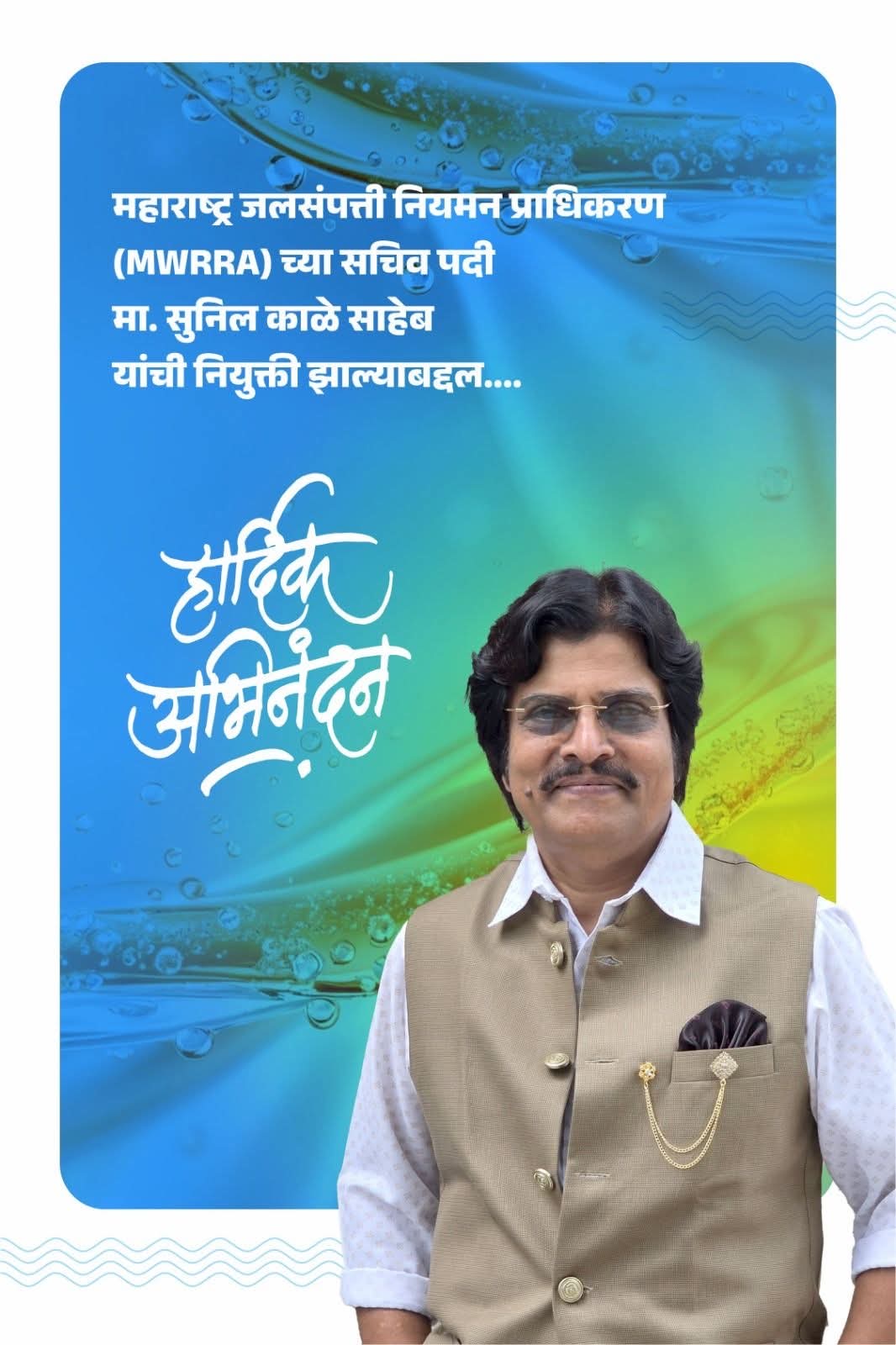 महाराष्ट्र जलसंपत्ती नियमन प्राधिकरण (MWRRA) या अत्यंत महत्त्वाच्या संस्थेच्या सचिवपदी मा. सुनील काळे साहेब यांची झालेली नियुक्ती ही जलव्यवस्थापन क्षेत्रासाठी एक सकारात्मक आणि आशादायी पाऊल मानली जात आहे. राज्यातील पाणीवाटप, जलसंपत्तीचे नियोजन आणि त्याचे योग्य व्यवस्थापन या दृष्टीने MWRRA ची भूमिका अत्यंत महत्त्वाची आहे, आणि अशा जबाबदारीच्या पदावर अनुभवी व